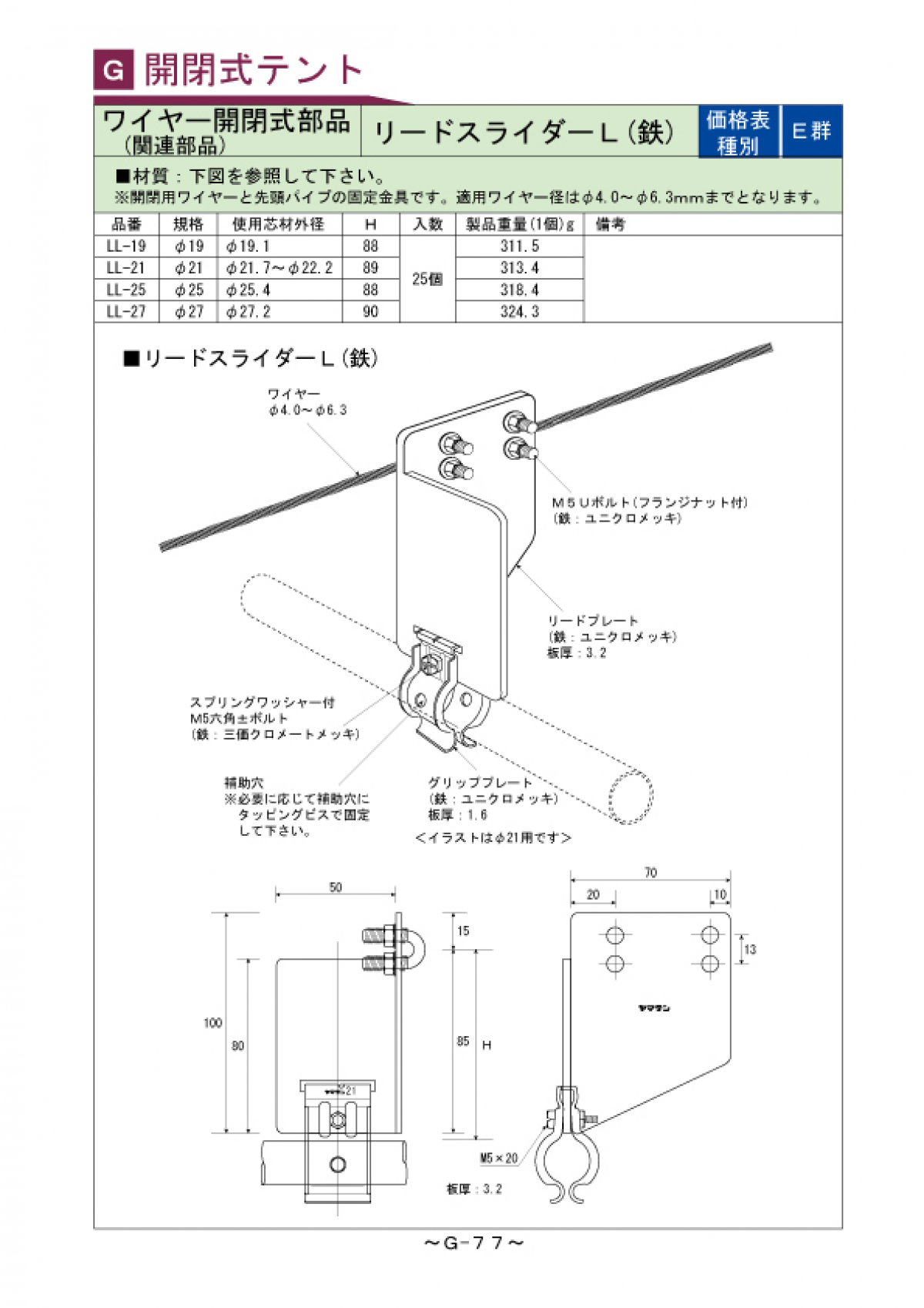 G-75~78 関連部品 G-75 丸カン(鉄/SUS)・ステンレス割りピン・プロテクト5 PDF 詳細 G-76 リードスライダーS(鉄) PDF 詳細 G-77 リードスライダーL(鉄) PDF 詳細 G-78 リードスライダーL(SUS) PDF 詳細