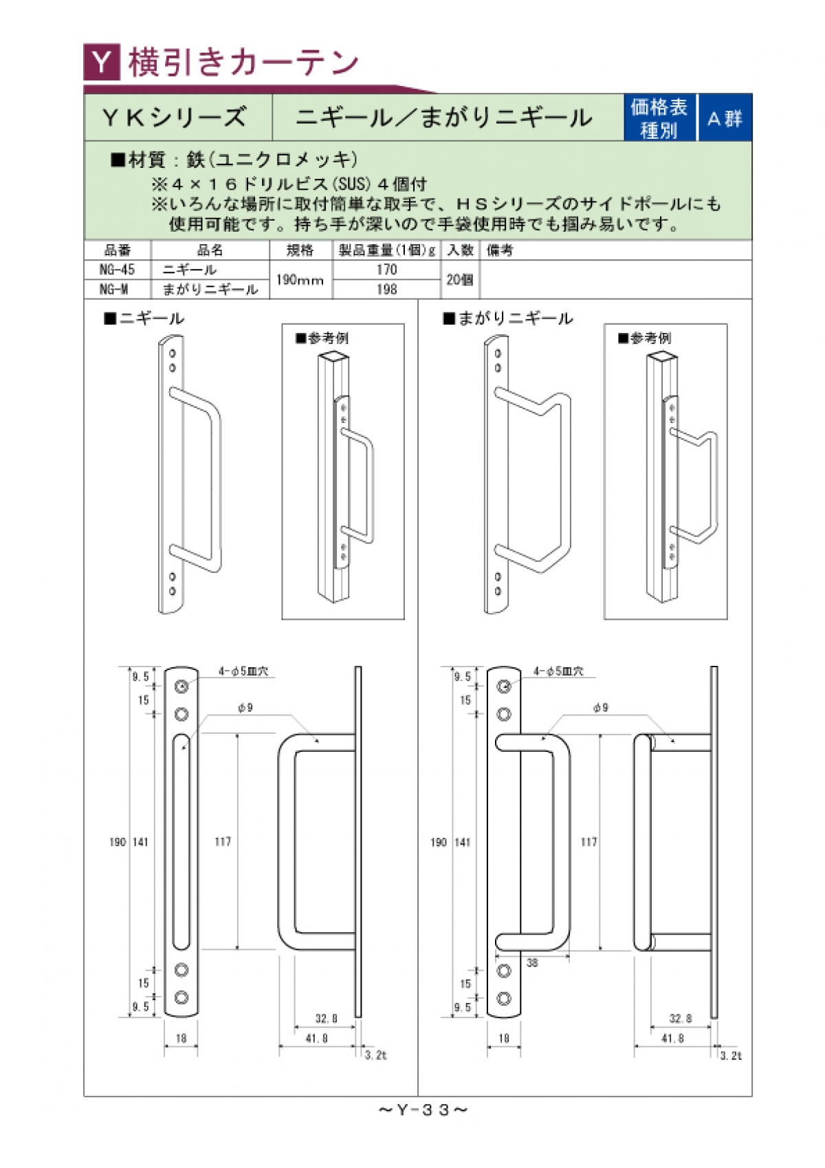 Y-33~38 YKシリーズ Y-33 ニギール・まがりニギール PDF 詳細 Y-34 落し込み φ15 PDF 詳細 Y-35 落し受50(鉄)・落し受(SUS) PDF 詳細 Y-36 薄型マグネットキャッチ PDF 詳細 Y-37 アルミ材 PDF 詳細 Y-38 ステンレス材 PDF 詳細